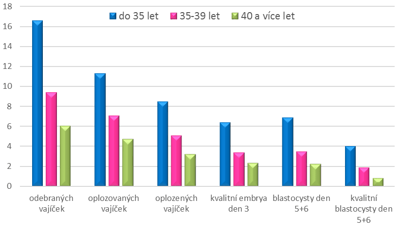Graf: Porovnání oplození vajíček a dalšího vývoje embryí u pacientek různých věkových skupin. Je zřejmé, že v průměru více než třetina embryí, která se správně vyvíjí 3. den, by se transferovala zbytečně, jelikož z nich nevzniknou kvalitní blastocysty den 5 a 6. Z grafu je také patrné, že přestože spousta embryí doroste do stádia blastocysty, nejsou tato embrya kvalitní a vhodná k použití (ET, mražení, PGT vyšetření). Průměrně téměř polovina blastocyst nemá dostatečnou kvalitu (záleží ale také na věku pacientky).
