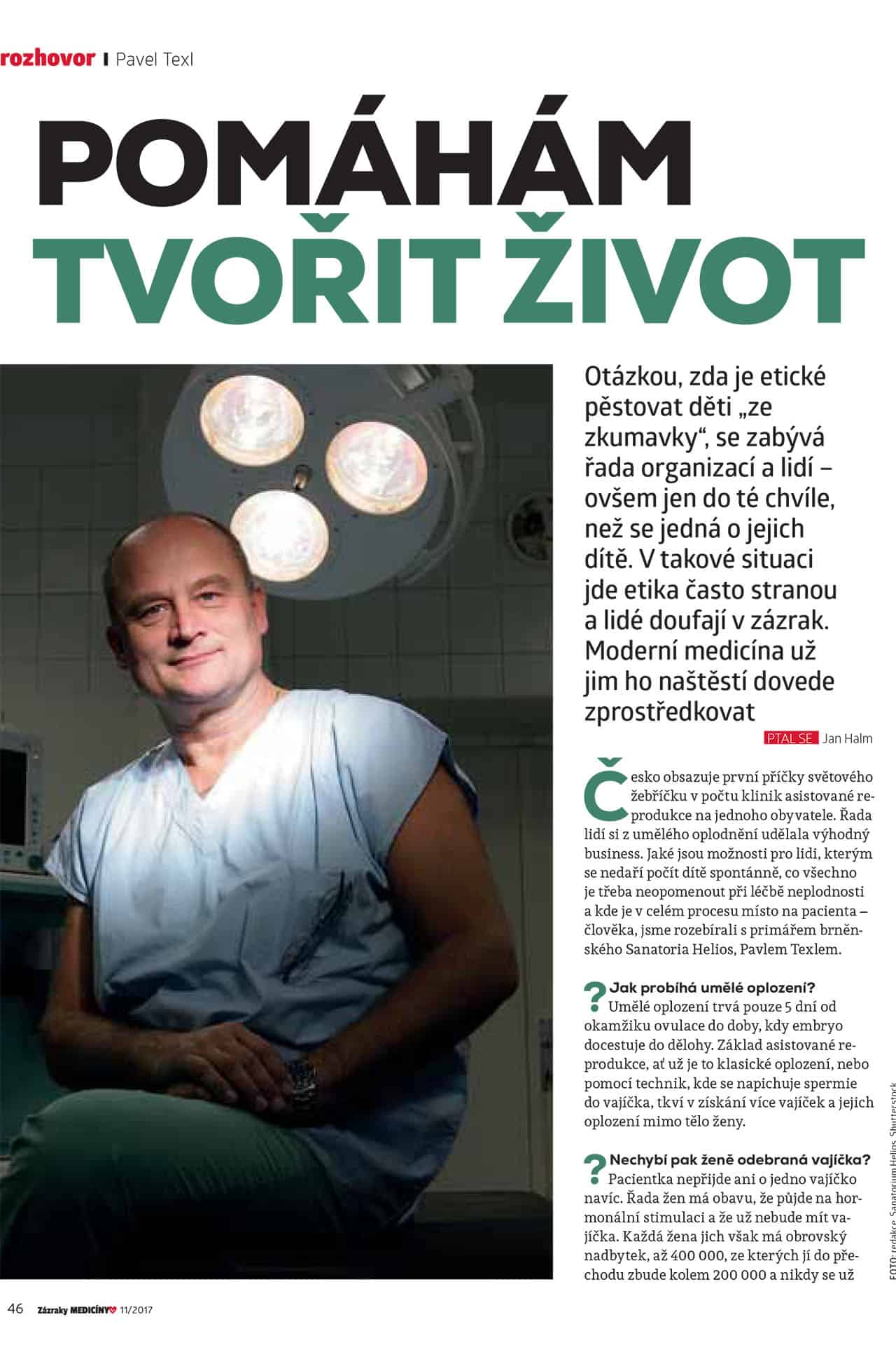 V listopadovém vydání časopisu 100+1 Zázraky medicíny je publikován rozhovor s prim. MUDr. Pavlem Texlem, vedoucím lékařem Sanatoria Helios o tom, jaké jsou dnes možnosti pro lidi, kterým se nedaří počít spontánně, co všechno je třeba neopomenout při léčbě neplodnosti i o dalších aspektech umělého oplodnění.